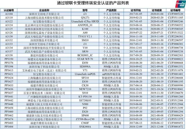 以下為通過銀聯受理終端安全證人的產品列表: