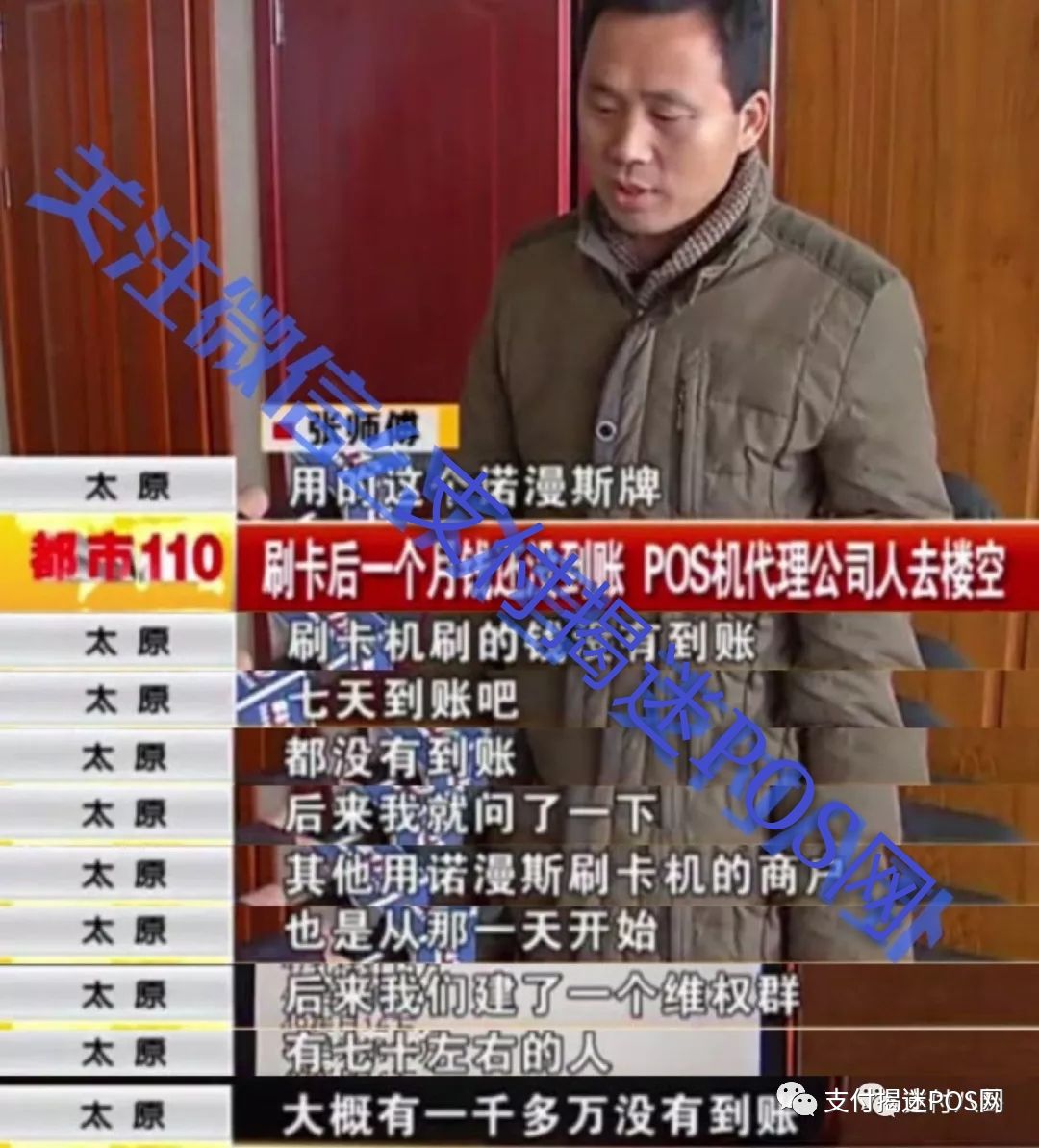 視頻中張師傅表示自己用“諾漫斯“牌的POS機(jī),刷了3萬(wàn)多元錢(qián)一直沒(méi)有到賬!據(jù)張師傅介紹:”諾漫斯“的這個(gè)POS機(jī)刷卡后是7天到賬,但是已經(jīng)過(guò)了四個(gè)7天了,依然遲遲不見(jiàn)到賬信息!于是張師傅便聯(lián)系了同樣在使用”諾漫斯“品牌POS機(jī)的其他商戶(hù),大家都表示自己刷的錢(qián)也沒(méi)有到賬!據(jù)了解此次刷卡不到賬涉及70多人,累計(jì)不到賬金額一千多萬(wàn)元!
