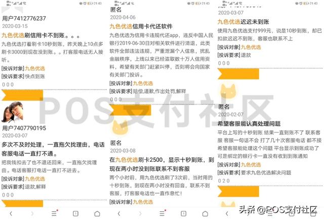 2020年4月8日,某網友反映其使用的“九色優選”代還APP不到賬,據了解官方說的是十秒鐘到賬,但幾個小時過去了仍未到賬;隨后小編查詢各大投訴平臺發現,近日“九色優選”頻繁性遭用戶投訴不到賬。