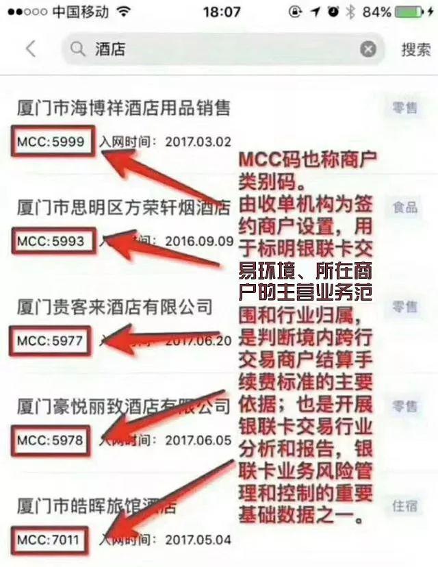 商戶類型碼(通稱MCC,MCC碼)四位大數(shù)字編碼構成。由三方支付平臺為簽訂商戶設定,用以標出銀聯(lián)信用卡交易自然環(huán)境、所屬商戶的主營范疇和制造行業(yè)所屬,是分辨地區(qū)轉賬交易商戶清算服務費規(guī)范的關鍵根據(jù);都是進行銀聯(lián)信用卡交易行業(yè)現(xiàn)狀和匯報,銀聯(lián)信用卡業(yè)務流程風險管控和操縱的關鍵數(shù)據(jù)資料之一。